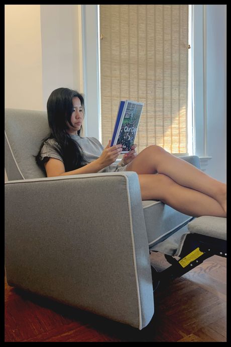 The glider rocker that I heard about the most in my conversations with parents and experts was the Luca by Canadian company Monte. It was recommended by Strategist senior editor Winnie Yang and four other experts I spoke to, so I had to go check it out for myself. Yang told me that she was drawn to how streamlined it look, and the first thing I noticed was its relatively compact size compared to other nursery chairs on the market. As Ashlee Neuman, content director at the Bump, points out, that’s what makes the Luca great for families with limited space. It also looks really nice, with its slightly upturned ergonomic armrests, high back, and contrast piping detail. Most importantly, the gliding motion felt super smooth and pleasant. My feet were planted on the floor and I was able to easily move the chair back and forth.