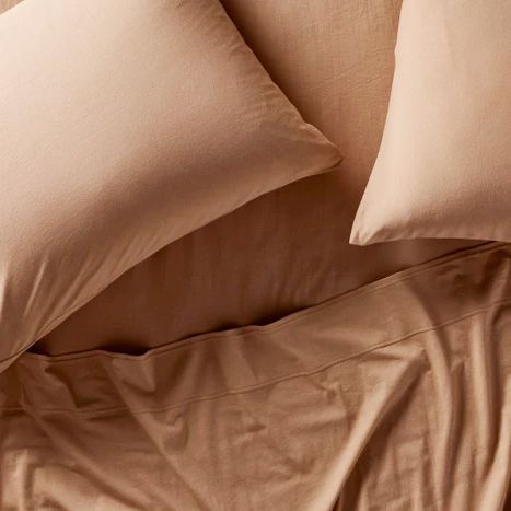Jersey: Another popular cotton bedding type is jersey, which you may associate with college dorms because of its accessible price point and the way it feels like your favorite worn-in T-shirt (and is just as low-maintenance). Jersey fabric is knit instead of woven, often from cotton or cotton blended with synthetic fibers, giving it a soft, stretchy, cozy hand feel.