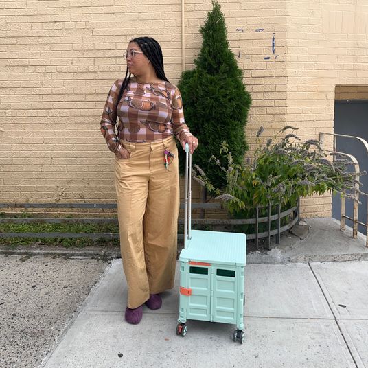Right now, this woman does not. As such, I have spent many moons searching “wide-legged maternity pants” online, trying in vain to maintain my sense of style and self within the sci-fi boy morph that is pregnancy. Eventually, my search paid off, and I found a pretty dope pair of maternity carpenter pants — sure, they were a fast=fashion Kamm Handy Pant knockoff with a disturbingly low fly, but for a few months they’d certainly do. They worked with my tomboy vibe, and I decided I’d wear them every day, like a uniform, styled with one of the gigantic oxford button-ups from my gigantic oxford button-up collection. (If anyone’s wondering where I get my gigantic oxfords, they’re mostly from my sister, who runs a vintage Instagram site called Baer Vintage that specializes in high-quality basics from better times.) This uniform worked for a while, until I saw my reflection in a shop window somewhere near 30 weeks and realized that the bagginess was bringing me down. The floating sack of my body no longer had any mystery to it. I was just a large convex shape covered in lots of cloth.
