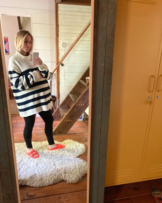 It’s the last day of my Bumpsuit experiment, which breaks my heart a little bit. To think that I will no longer be tracking my outfits and feelings in my Notes app. Luckily, these Bumpsuits are mine to keep. Today, I put a striped sweater from Apiece Apart over my Lucy. It’s cold but sunny, and I head to a nearby town to get a coffee and a smoothie and a cookie in close succession — today I am taking advantage of the “free” part of being a “freelance writer.” I dip into antique stores and carefully maneuver my belly through the tight aisles. I go to the bookstore and touch all the books, then buy the ones that speak to me. It is rare that things feel easy like this, I think, when nothing is rubbing up against anything else. This new uniform makes me feel a little lighter on my feet, a little more taken care of, a little more like the fullest version of myself. A shop owner eyes my midsection and congratulates me, and I proudly tell him, “Thank you.”
