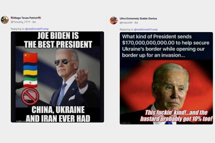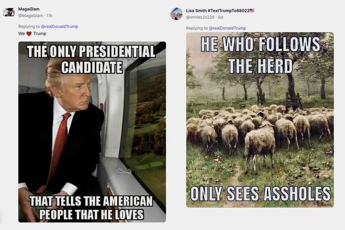 Trump is by far the most popular poster on Truth Social, to the point that the site is basically structured around his frequent posts. His replies are one of the only places other posters can reliably be seen, and they can be seen posting predictable things in response to “Truths” that are written in late Trump style (Truth Social has a 1,000-character limit):